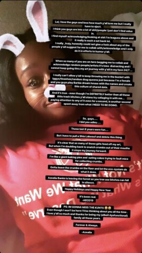 Pero además de esto, la tía ha amenazado ya unas cuantas veces con abandonar el mundo de la música para siempre porque «nadie la valora», aunque al final nunca ha cumplido con su palabra. Sin embargo, Azealia ha vuelto a anunciar que se retira.