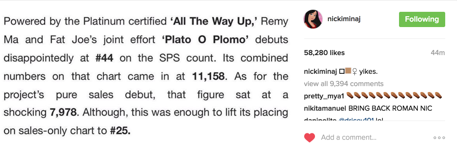A lo largo del fin de semana, Nicki Minaj decidió devolver los disparos a la autora de ‘Plata o Plomo’, colgando una fotografía en Instagram donde se reía de las ventas del último trabajo de su rival.