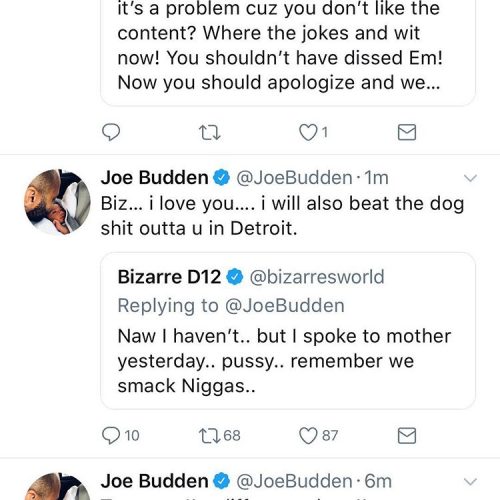 Y hace apenas tres días, Budden escribió unos tweets –que se ha encargado de borrar- en los que contestaba a Bizarre, haciendo mención a la escasa relación que mantiene con Eminem