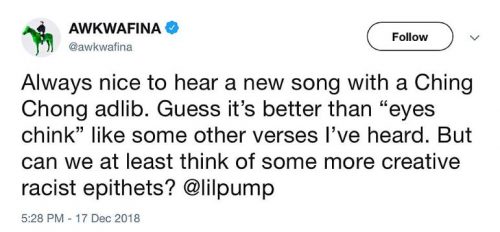 El vídeo de Pump llegó a los oídos de Awkwafina, actriz que ha participado en «Crazy Rich Asians» y «Ocean’s 8», que respondió con elegancia y una fina ironía a la actitud del artista en un mensaje de Twitter que borró poco después:
