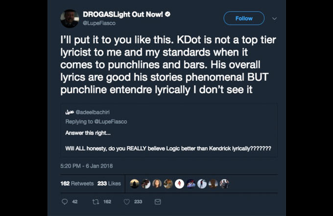 Aunque el mismo Kendrick posiblemente comparta opinión con él, ya que muchos recordarán haberle oído decir que no es un liricista , sino un tipo con cosas que contar, pero aún así a muchos usuarios no les han sentado nada bien estos comentarios. Fiasco añadía también:
