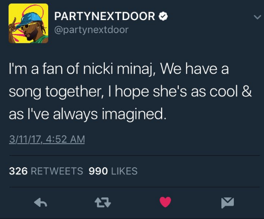 El cantante canadiense también tomó su cuenta de Twitter para pronunciarse respecto a este suceso, sin embargo, sus publicaciones ya se encuentran borradas. A través de ellas, PartyNextDoor sólo intentaba evitar un enfado de Nicki Minaj con él: