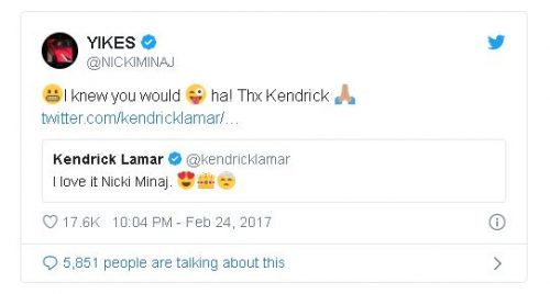 Nicki bromeó con que «él no quería lavarse» en un principio, pero después se deshizo en halagos hacia su compañero, afirmando que «es una gran admiradora suya y de su talento» además de que «espera colaborar con Kendrick en algún momento».