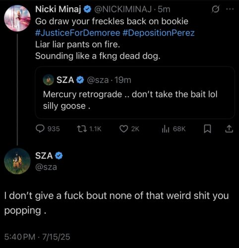 Y el último objetivo de la ira de Nicki ha sido SZA, a la que le ha dicho de todo en las últimas horas. No sabemos qué le ha hecho SZA a Nicki Minaj, pero desde luego la ira no podía ser mayor.