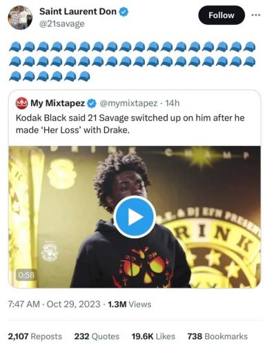 Durante el podcast, Kodak Black hizo comentarios sobre su relación con Drake, lo que sugiere un cambio en su dinámica después de haber colaborado juntos en un álbum. Estos comentarios obtuvieron una respuesta de 21 Savage en Twitter, a quien Yak había acusado de cambiar tras juntarse con Drizzy.