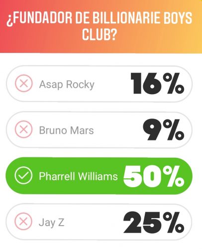 Os gustaría que hubiera sido Rocky o JAY-Z, pero la respuesta correcta es Pharrell Williams que junto a NIGO de A Bathing Ape fundaron BBC. El 50% sabíais la respuesta.