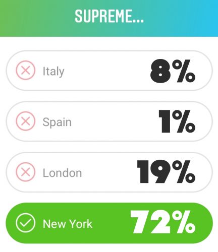 Imitada en todo el mundo con marcas como Supreme Italy o Supreme Spain. No te confundas, la original se fundó en Nueva York en 1994. Controláis bastante de Supreme, ya que el 72% habéis acertado.