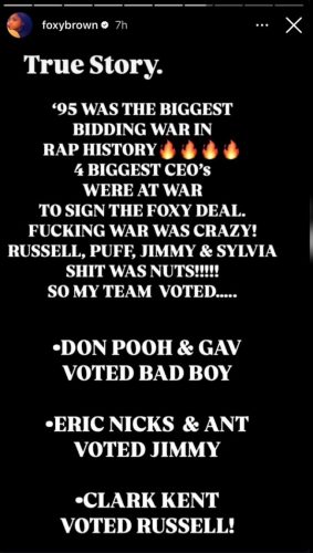 Historia real. En el año 95 tuvo lugar la mayor guerra de pujas de la historia del rap. Los cuatro mayores CEOs estuvieron en guerra para intentar fichar a Foxy Brown. Aquella jodida guerra fue una locura. Russell Simmons, Puff Daddy, Jimmy Iovine y Sylvia Rhone. Aquella mierda fue una locura. Elegí a Russell, con el incentivo de que JAY-Z tenía que ser fichado también. ¡Se viene el documental de Foxy Brown!
