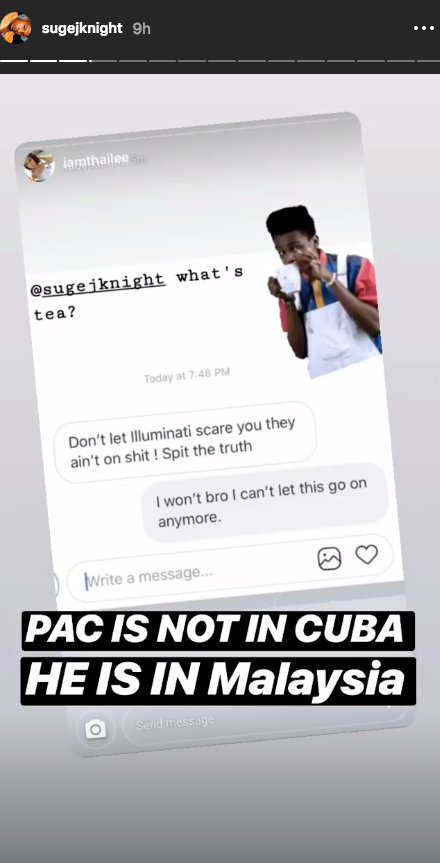 Muchas veces se ha comentado en los últimos años que se ha visto vivo a Tupac, normalmente en un lugar apartado de su Harlem natal como Cuba. Y parece que el hijo de Suge Knight está del lado de estas teorías conspiratorias, porque recientemente ha hecho unas afirmaciones bastante arriesgadas en su cuenta de Instagram. El chico subió fotos del de ‘California Love’ con dos artistas actuales como 50 Cent y Beyoncé, y también subió capturas de pantalla de unas conversaciones en las que le amenazaban «por hablar de más». ¿Una locura? Ahí van las pruebas.