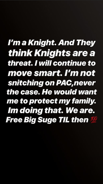 Soy un Knigt, y ellos piensan que los Knight son una amenza. Seguiré moviéndome con inteligencia. No estoy delatando a Tupac, de ninguna manera es el caso. Él querría que protegiera a mi familia, y eso estoy haciendo.