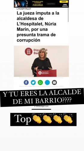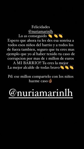 A través de sus stories también se dirigió directamente a la alcaldesa de L’Hospitalet. En el texto e imagen compartidos por Morad, se puede leer cómo compara el haber sido desterrado con un reciente caso de corrupción por parte de Nuria Marín. El rapero no es de esos que suelen callarse las cosas.