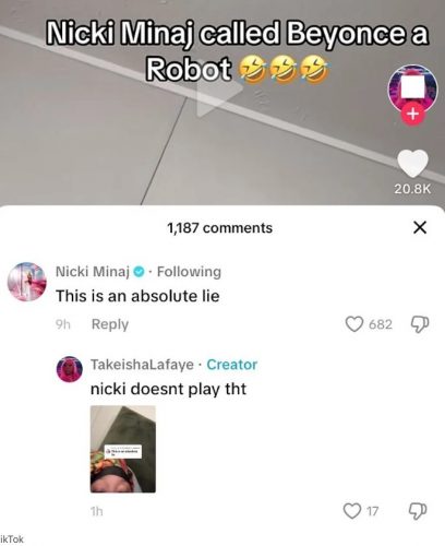 Ha sido en redes sociales donde un usuario sugirió que Nicki le estaba tirando a Bey en sus últimos vídeos de TikTok. Para sorpresa del usuario, esta fue la respuesta de la de Trinidad y Tobago:
