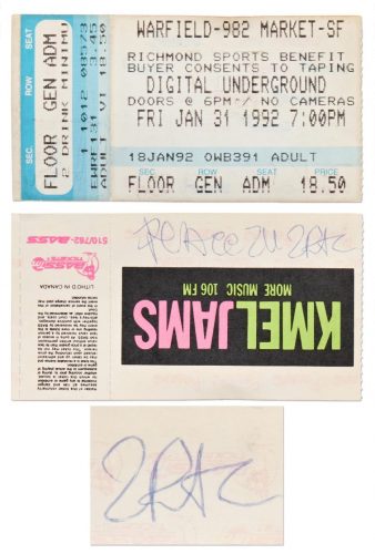 La entrada corresponde a un concierto de Digital Underground (ya saben, el grupo en el que estaba Shakur antes de su exitosa carrera en solitario) y en él se puede leer lo siguiente (aparte de la firma): «Paz para ti».