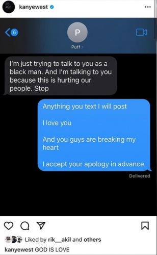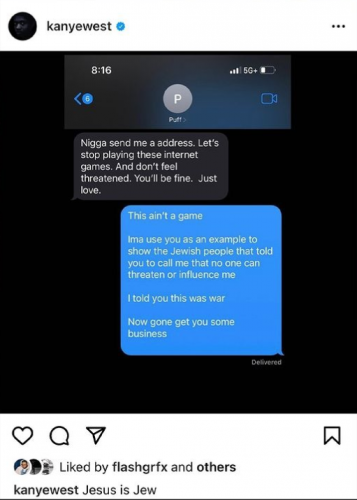 La decisión de la popular red social vino tras el intercambio entre Kanye y Diddy en el que Ye parecía afirmar que el neoyorkino estaba «controlado por judíos». Este fue el post de West: