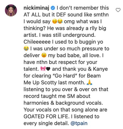 Parece que todo fue un malentendido y que ambos artistas se tienen un gran respeto. ¿Podremos escuchar en el futuro algo de estos dos juntos? Por ahora, lo único seguro es que Nicki Minaj dejó escapar una colaboración con T-Pain en el peak de este.