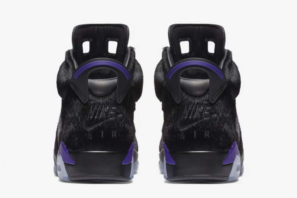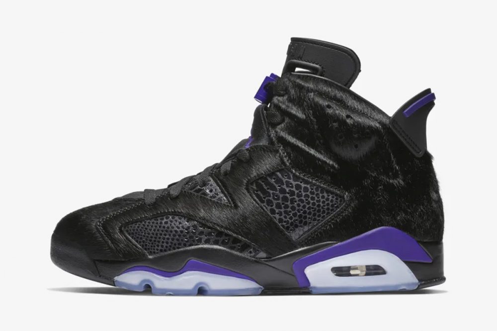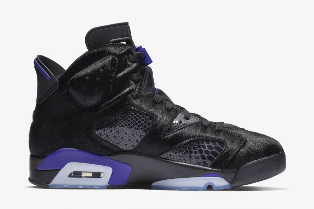 La combinación de los colores está inspirada en Black Cat, el alterego de Michael Jordan. Los detalles de violeta sobre una base negra con toques de piel de serpiente y pelo, convierten a las Social Status Air Jordan 6 en una pieza de coleccionista, aunque viendo los métodos de compra ya lo teníamos bastante claro.