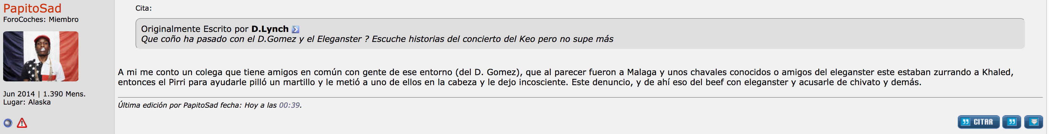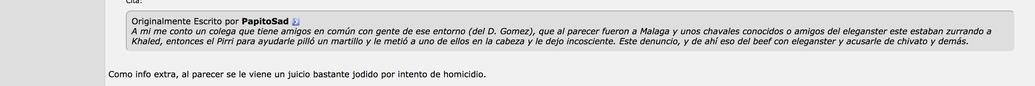 A mi me contó un colega que tiene amigos en común con gente de ese entorno (del D. Gomez), que al parecer fueron a Málaga y unos chavales conocidos o amigos del Eleganster este estaban zurrando a Khaled, entonces el Pirri para ayudarle pilló un martillo y le metió a uno de ellos en la cabeza y le dejo inconsciente. Este denuncio, y de ahí eso del beef con Eleganster y acusarle de chivato y demás.